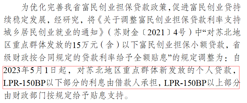 江苏省发布《通知》取消之前的全额贴息政策,由借款人承担LPR-150BP以下部分的利息;借款利息超过LPR-150BP以上部分由财政部门贴息。