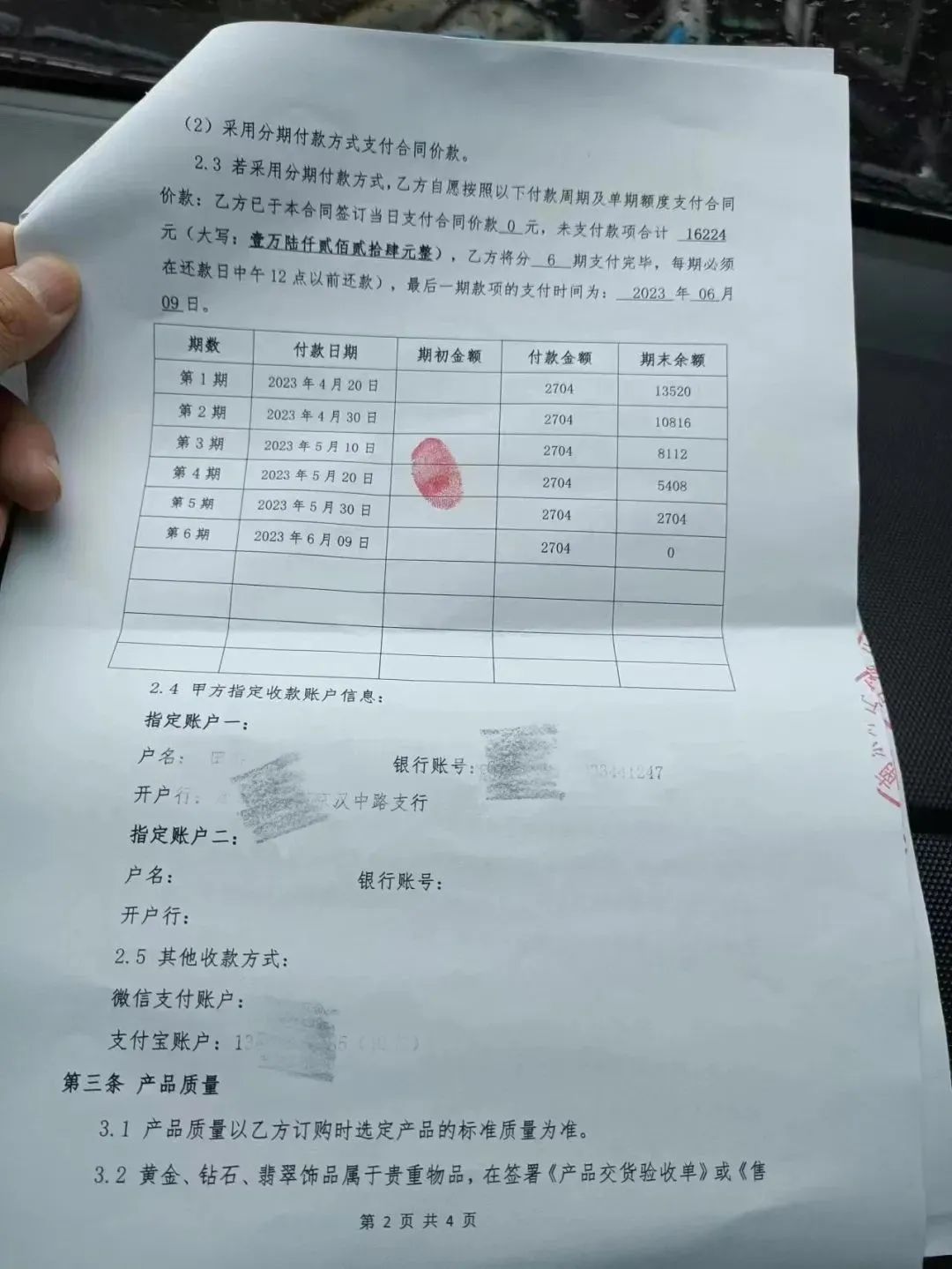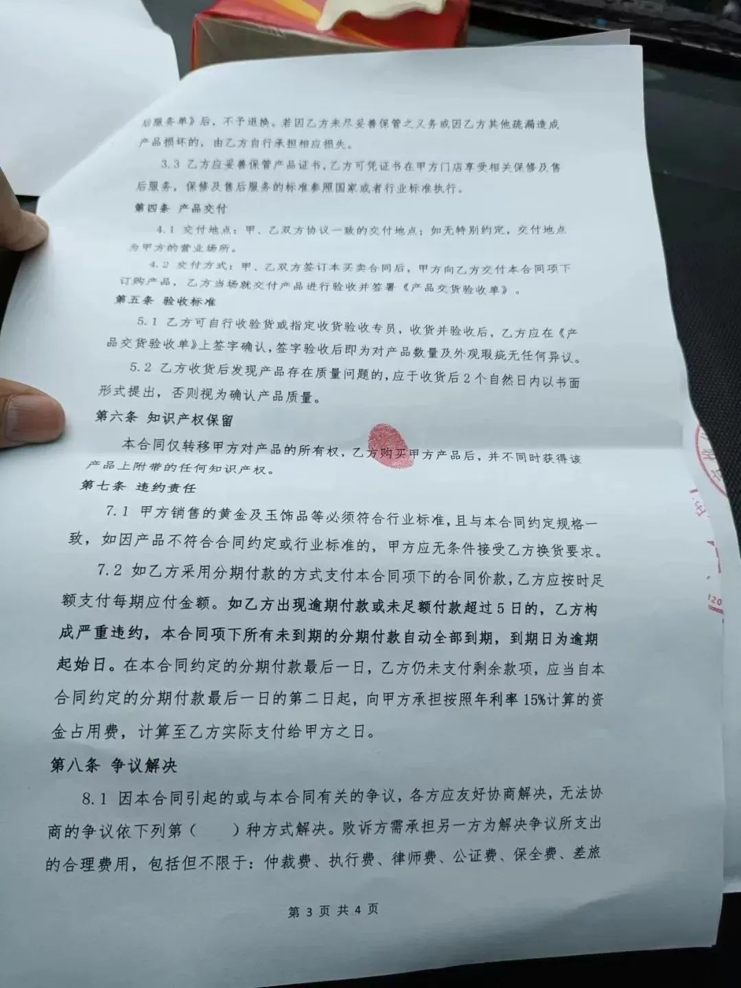 从上面的买卖合同中我们可以看到:乙方(借款人)购买了一个黄金(99.9足金)饰品,产品单价:580元/克,加工费:60元/克,重量:25.35克,价格/金额:16224元;